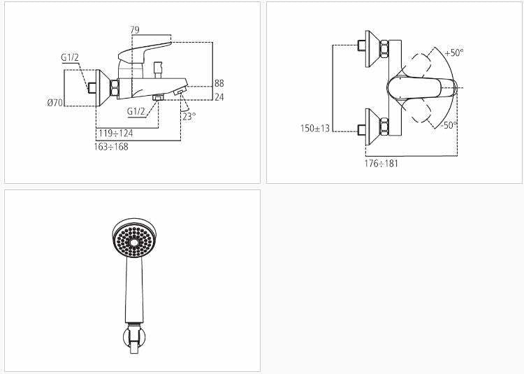 - Miscelatore esterno per vasca/doccia dotato di bocca di erogazione fissa e deviatore.