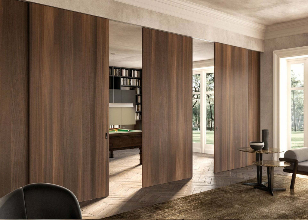 La porta scorrevole esterna muro presente il binario incassato, ideata per suddividere con eleganza gli spazi. E' possibile personalizzarlo scegliendo tra molteplici colorazioni laccate e alcune delle essenze legno più interessanti.