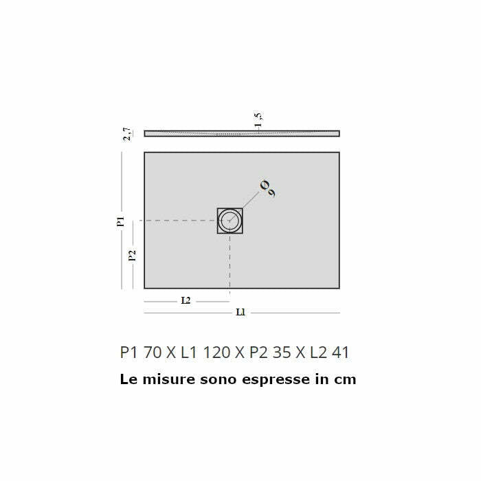 • Le dimensioni del piatto doccia rettangolare sono: 70 x 120 cm