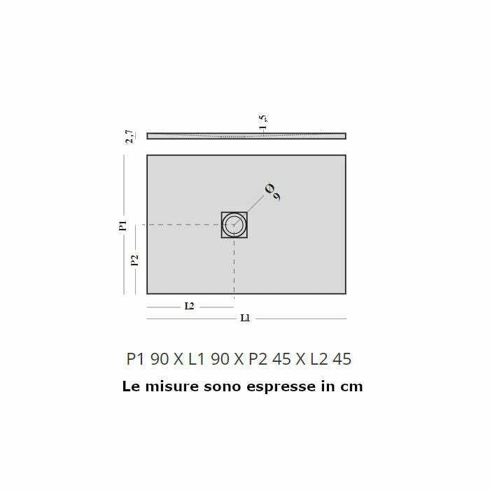 • Le dimensioni del piatto doccia quadrato sono: 90 x 90 cm