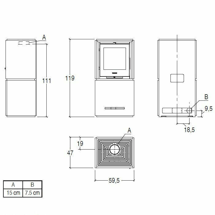 La stufa QUBE 2 riesce a raggiungere una potenza massima di 9,0 KW e possiede lo scarico fumi di serie superiore.