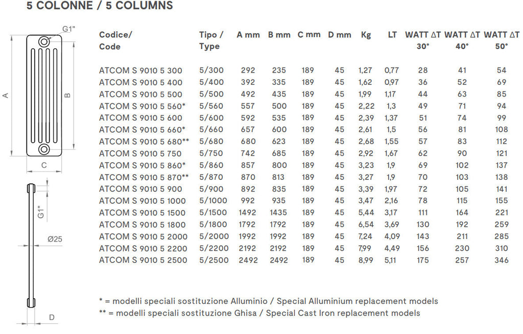 Radiatore a 5 colonne in acciaio Ercos Comby