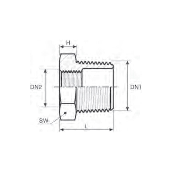 | CODE | DN1 | DN2 | DN1 x DN2 (inch) | L min (mm) | H (mm) | SW | Peso (g) | ||