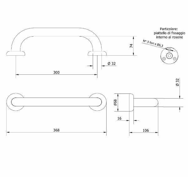 - Dimensioni maniglione comprensivo di rosone (L x P x H): 368 x 68 x 106 mm (Vedi foto tecnica)