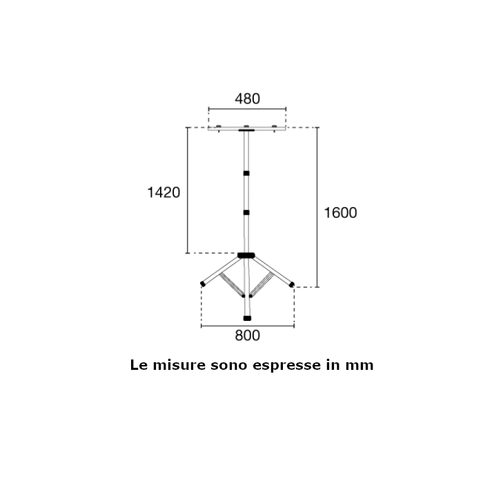 • Il trepiede da aperto possiede un ingombro di 80 cm di larghezza